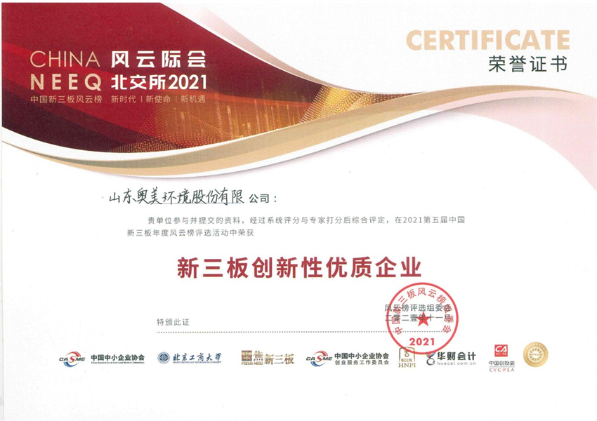 公司在2021年第五届中国新三板年度风云榜评选活动中,经过系统评分和组委会专家打分后综合评定后,荣获新三板创新性优质企业。